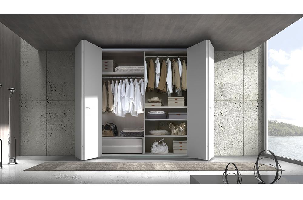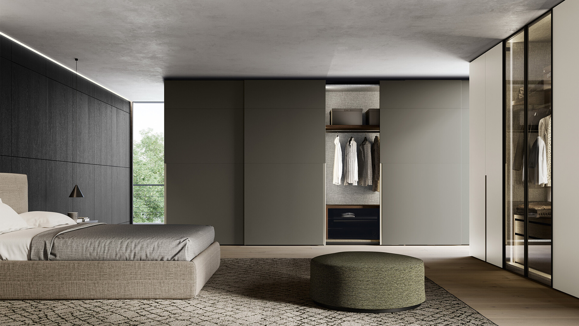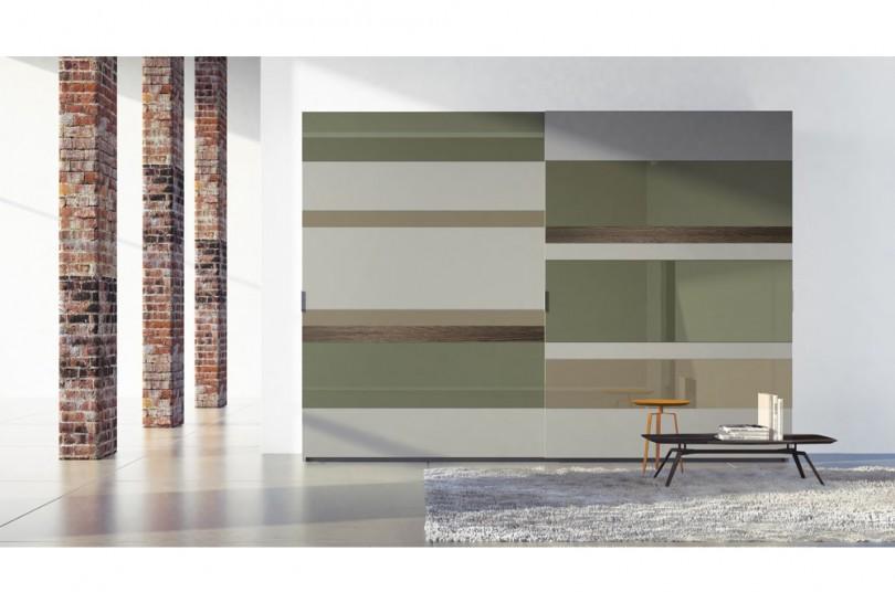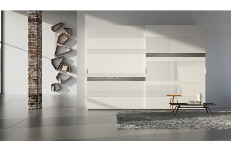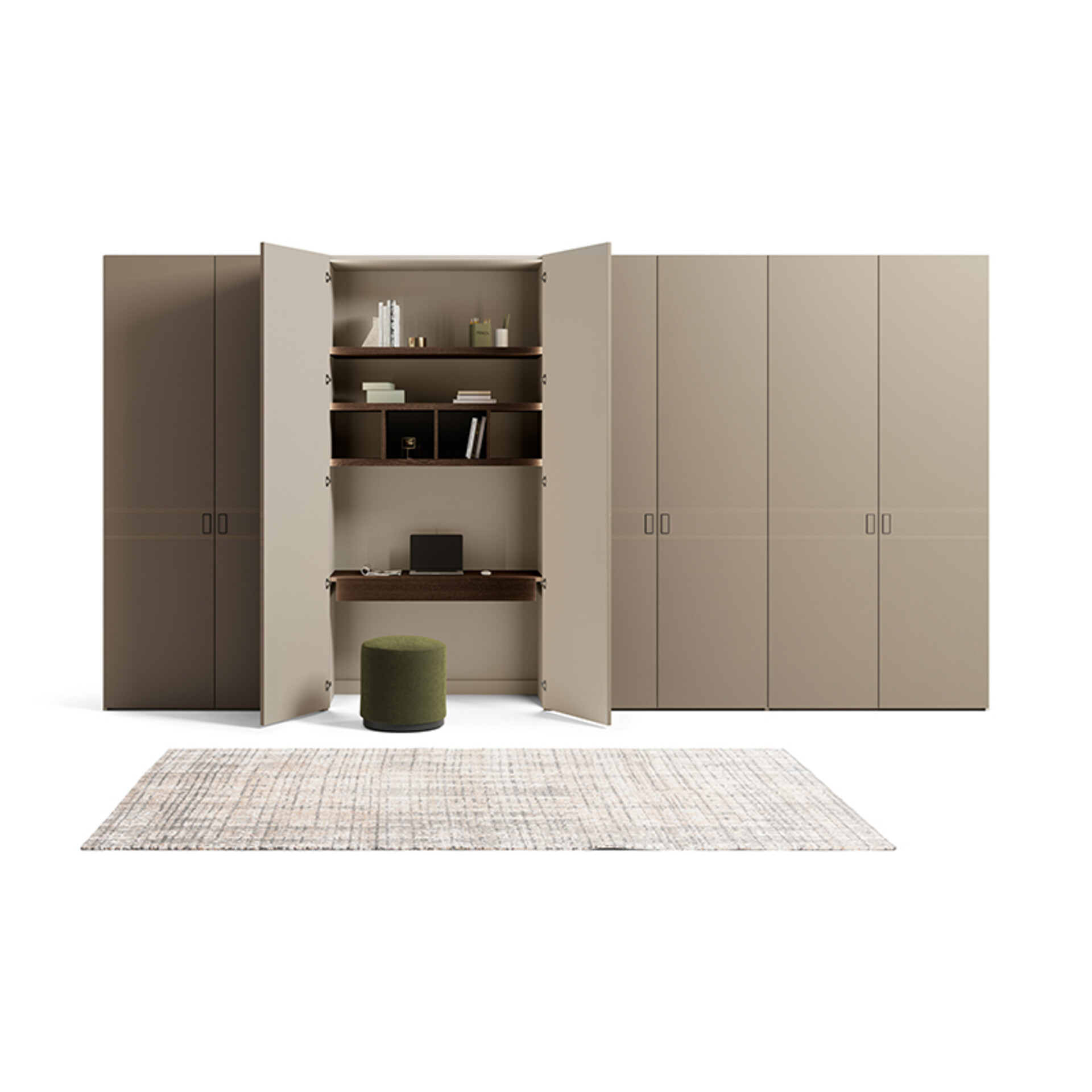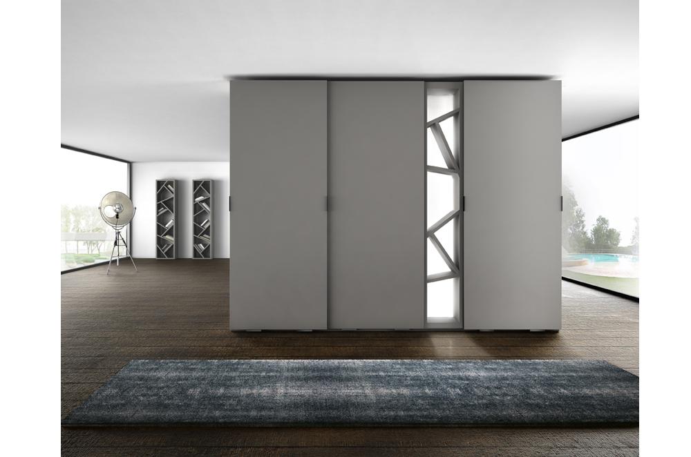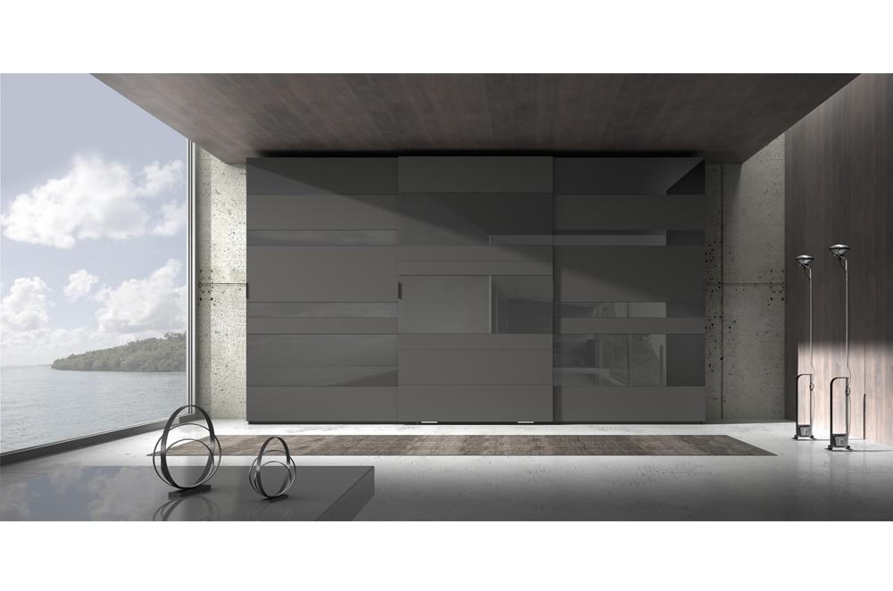 Armadi su misura, armadi ad anta battente dalle linee minimali, caratterizzati da un incavo centrale sagomato che hanno la funzione di presa maniglia. Come tutti gli armadi della collezione, si possono attrezzare con cassettiere, ripiani e tubi appendiabiti, oltre che con le luci a LED. Sono dispinobili in tutte le tonalità laccate opache. La particolarità degli armadi è l'anta: elegante e visivamente leggera, è in vetro finitura fumè o stop-sol con profilo brunito e maniglie integrate. L'anta che permette di intravedere il contenuto dell'armadio e hanno un agolo di apertura di 180 gradi, si abbinano perfettamente ai ripiani in vetro con telaio brunito, attrezzabili sempre con luci a LED.