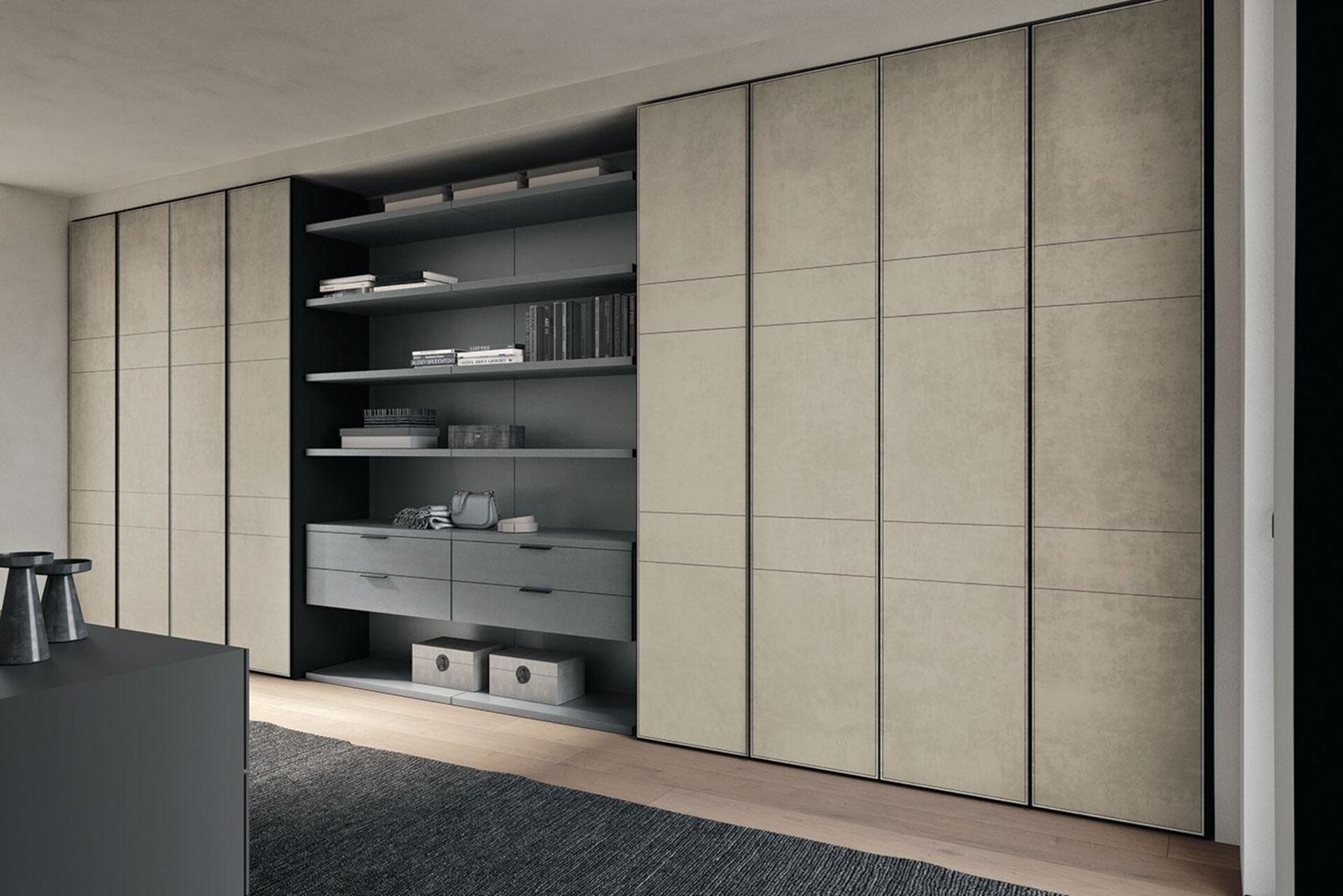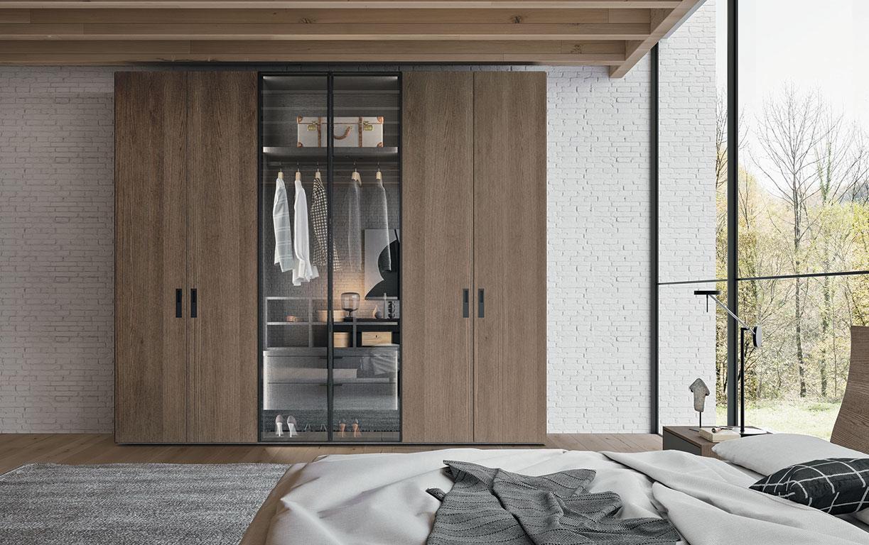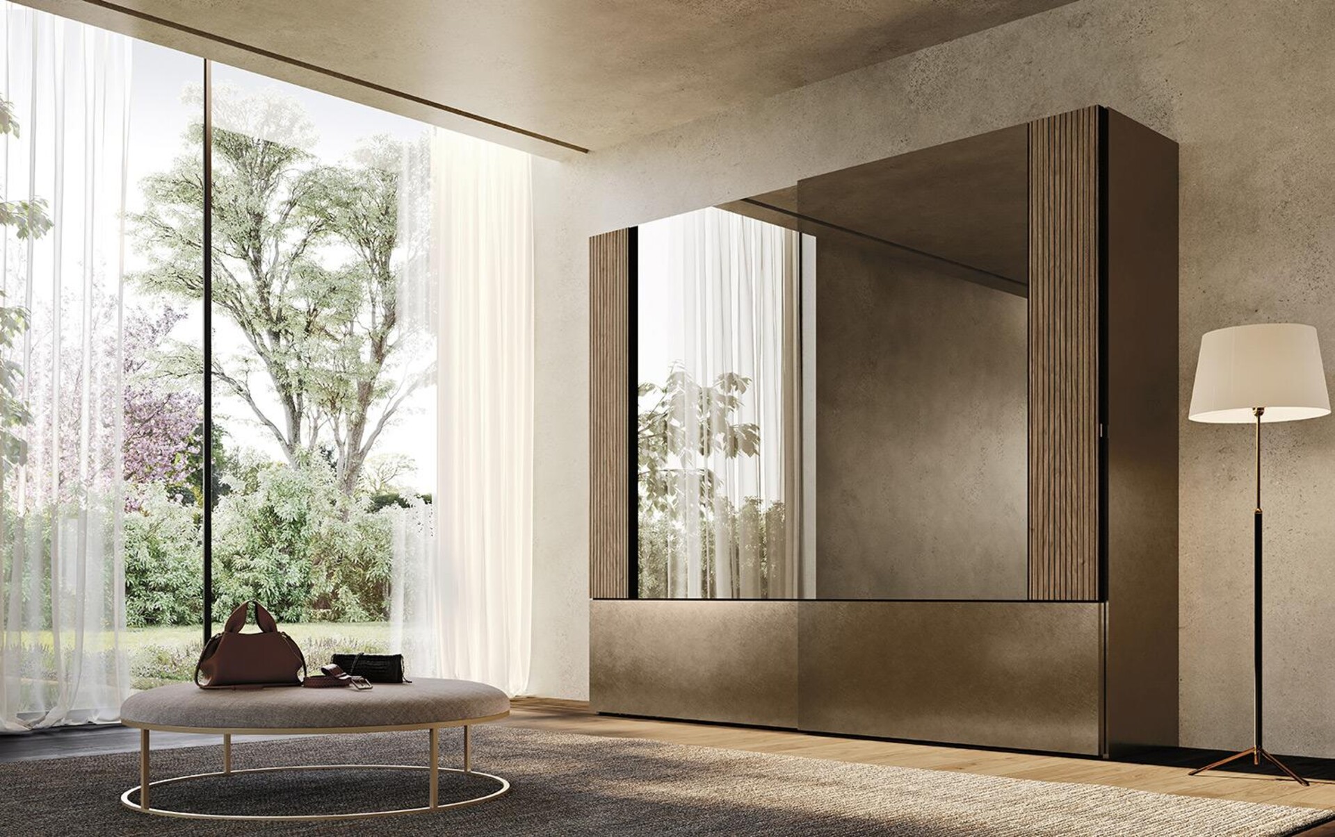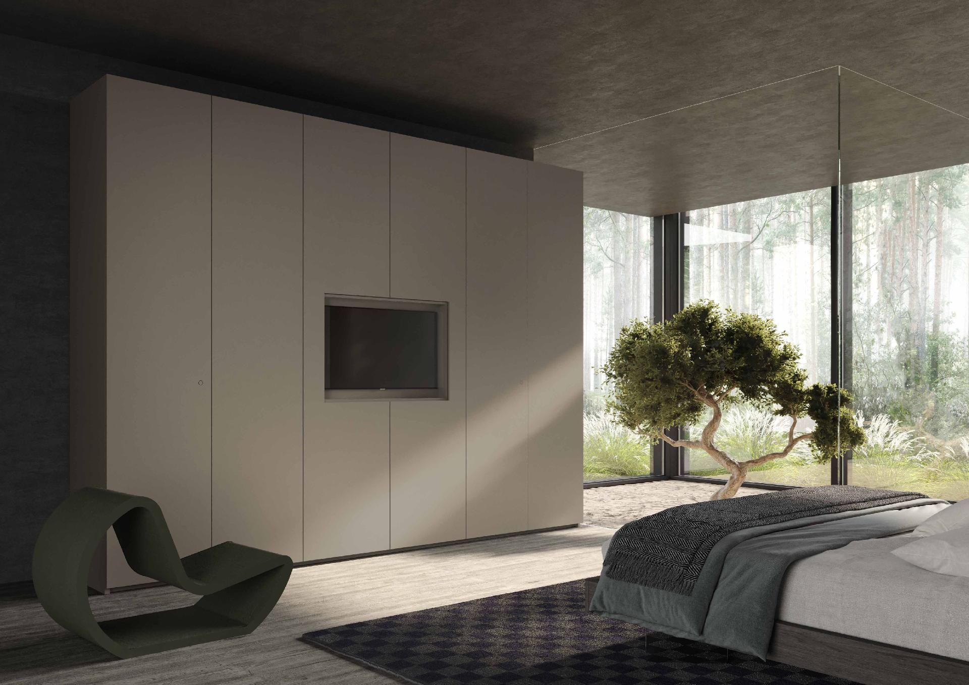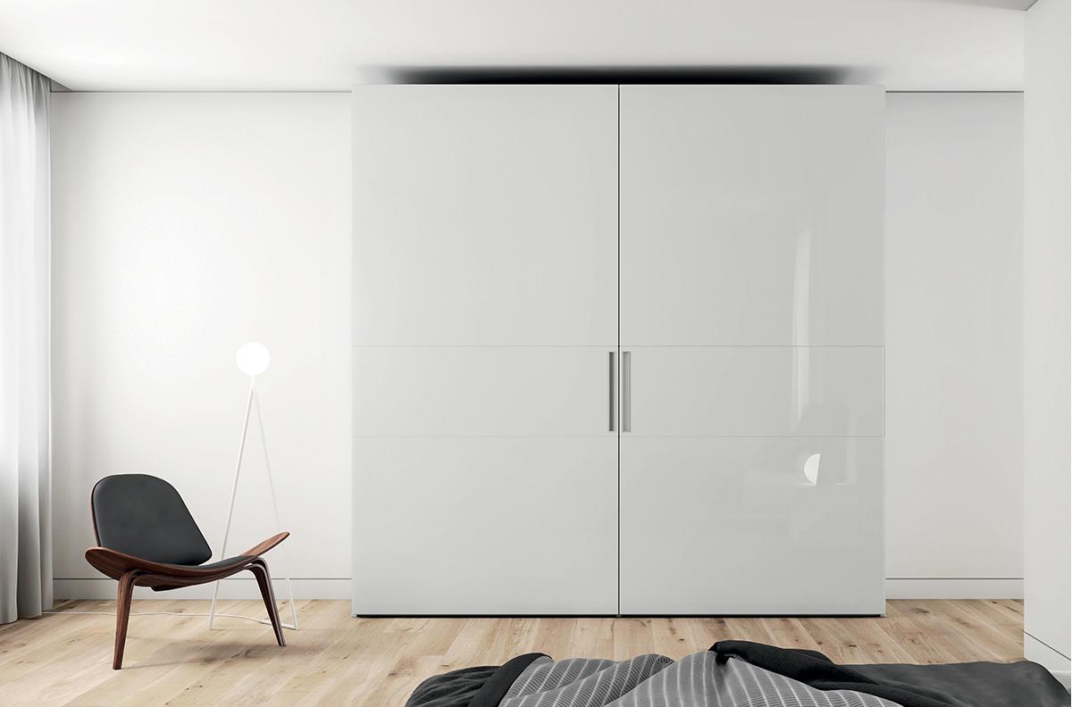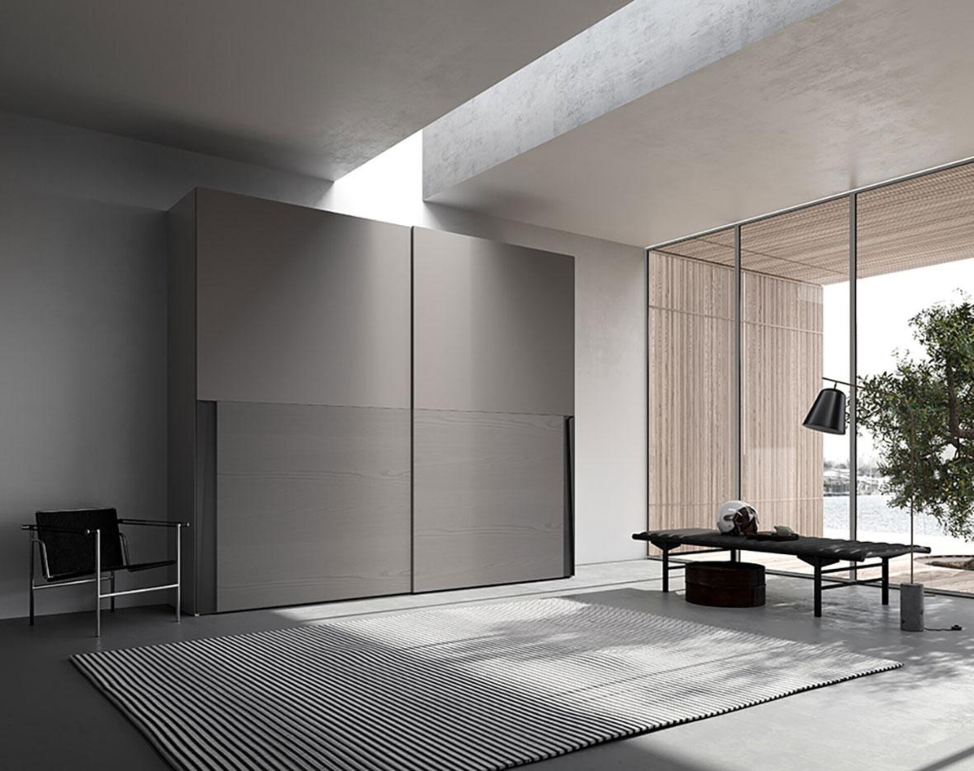 Armadi su misura, armadi ad anta battente dalle linee minimali, caratterizzati da un incavo centrale sagomato che hanno la funzione di presa maniglia. Come tutti gli armadi della collezione, si possono attrezzare con cassettiere, ripiani e tubi appendiabiti, oltre che con le luci a LED. Sono dispinobili in tutte le tonalità laccate opache. La particolarità degli armadi è l'anta: elegante e visivamente leggera, è in vetro finitura fumè o stop-sol con profilo brunito e maniglie integrate. L'anta che permette di intravedere il contenuto dell'armadio e hanno un agolo di apertura di 180 gradi, si abbinano perfettamente ai ripiani in vetro con telaio brunito, attrezzabili sempre con luci a LED.