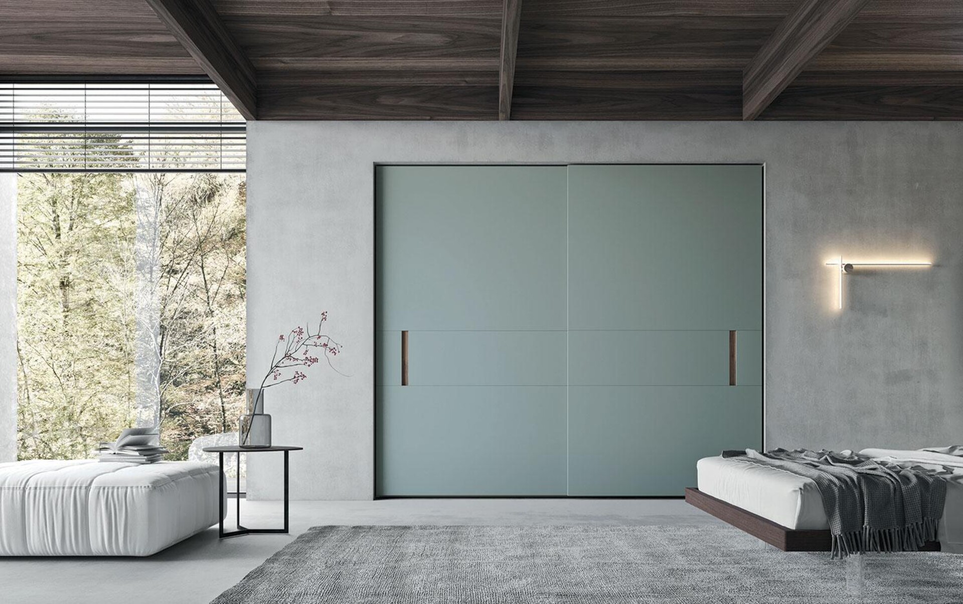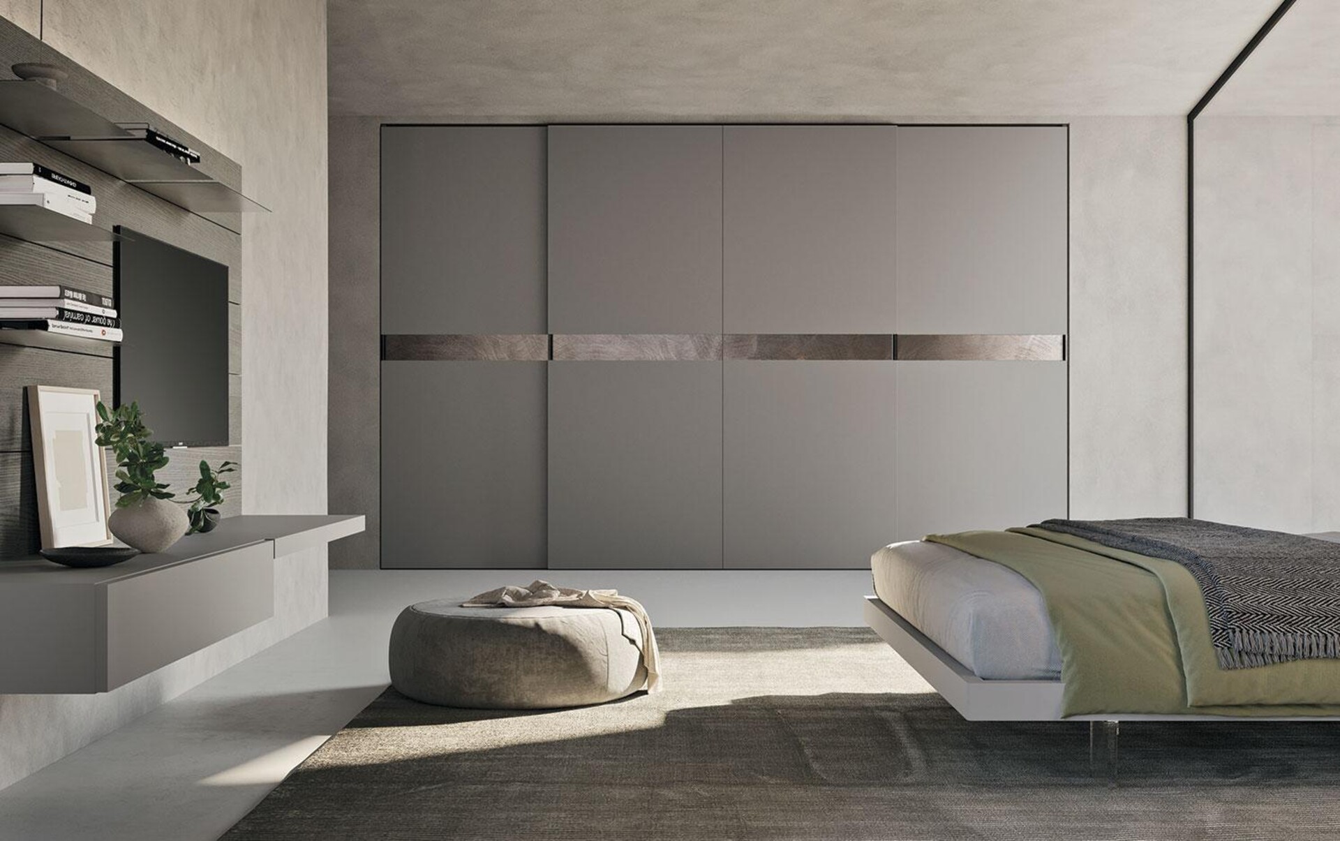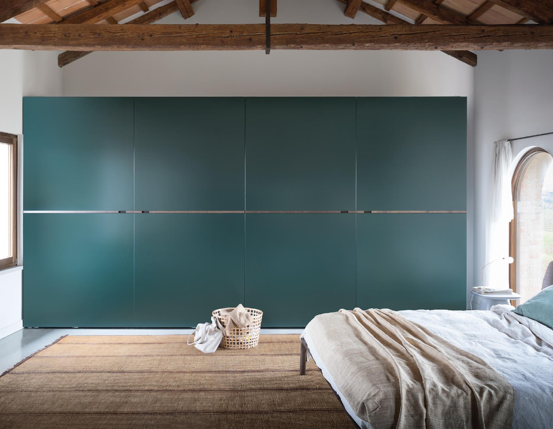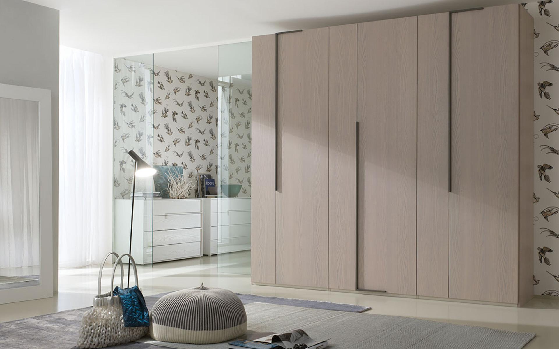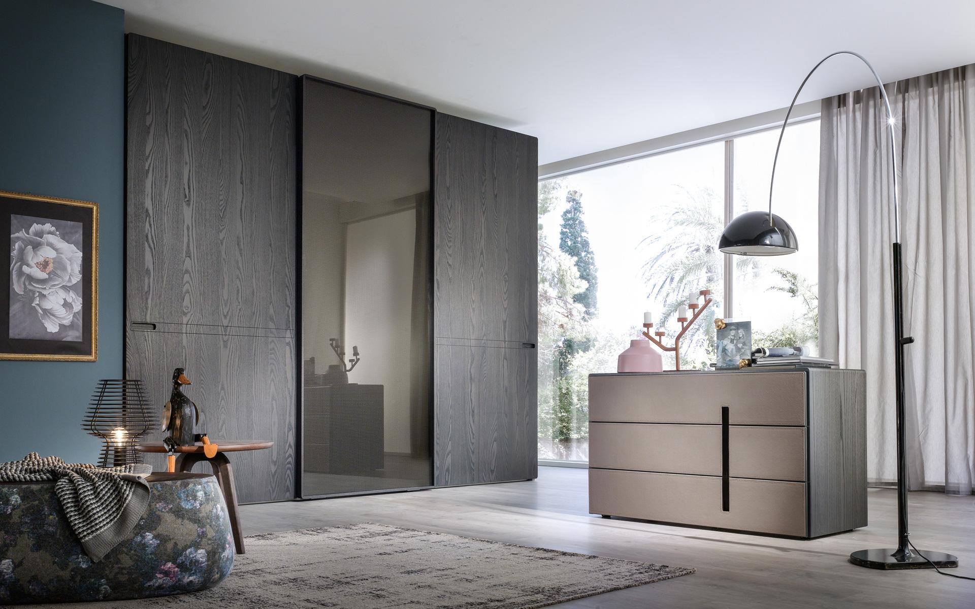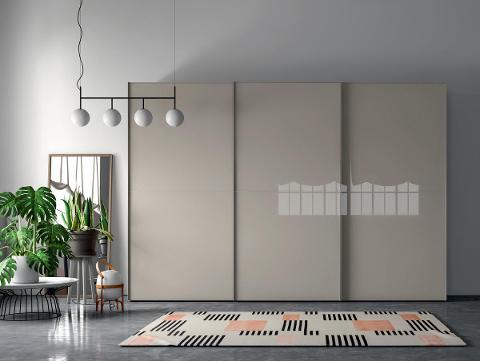 Armadi su misura, armadi ad anta battente dalle linee minimali, caratterizzati da un incavo centrale sagomato che hanno la funzione di presa maniglia. Come tutti gli armadi della collezione, si possono attrezzare con cassettiere, ripiani e tubi appendiabiti, oltre che con le luci a LED. Sono dispinobili in tutte le tonalità laccate opache. La particolarità degli armadi è l'anta: elegante e visivamente leggera, è in vetro finitura fumè o stop-sol con profilo brunito e maniglie integrate. L'anta che permette di intravedere il contenuto dell'armadio e hanno un agolo di apertura di 180 gradi, si abbinano perfettamente ai ripiani in vetro con telaio brunito, attrezzabili sempre con luci a LED.