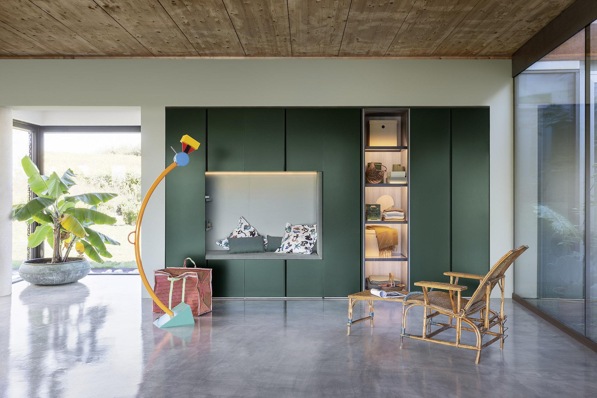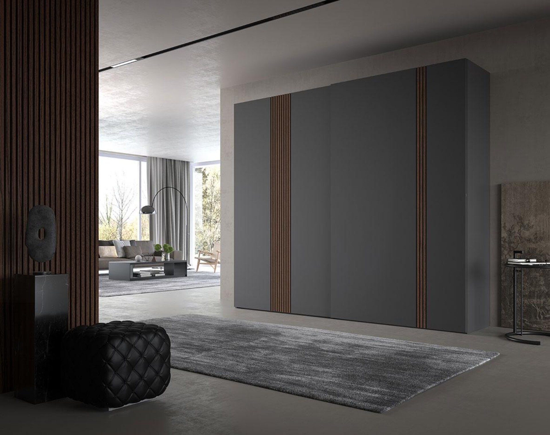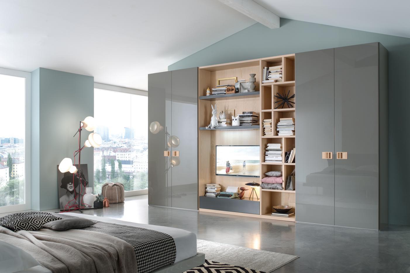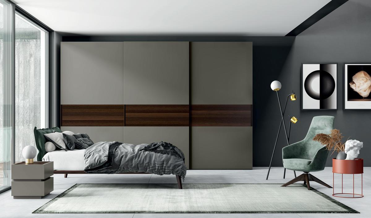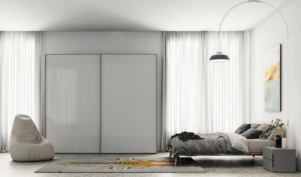 Armadi su misura, armadi ad anta battente dalle linee minimali, caratterizzati da un incavo centrale sagomato che hanno la funzione di presa maniglia. Come tutti gli armadi della collezione, si possono attrezzare con cassettiere, ripiani e tubi appendiabiti, oltre che con le luci a LED. Sono dispinobili in tutte le tonalità laccate opache. La particolarità degli armadi è l'anta: elegante e visivamente leggera, è in vetro finitura fumè o stop-sol con profilo brunito e maniglie integrate. L'anta che permette di intravedere il contenuto dell'armadio e hanno un agolo di apertura di 180 gradi, si abbinano perfettamente ai ripiani in vetro con telaio brunito, attrezzabili sempre con luci a LED.
